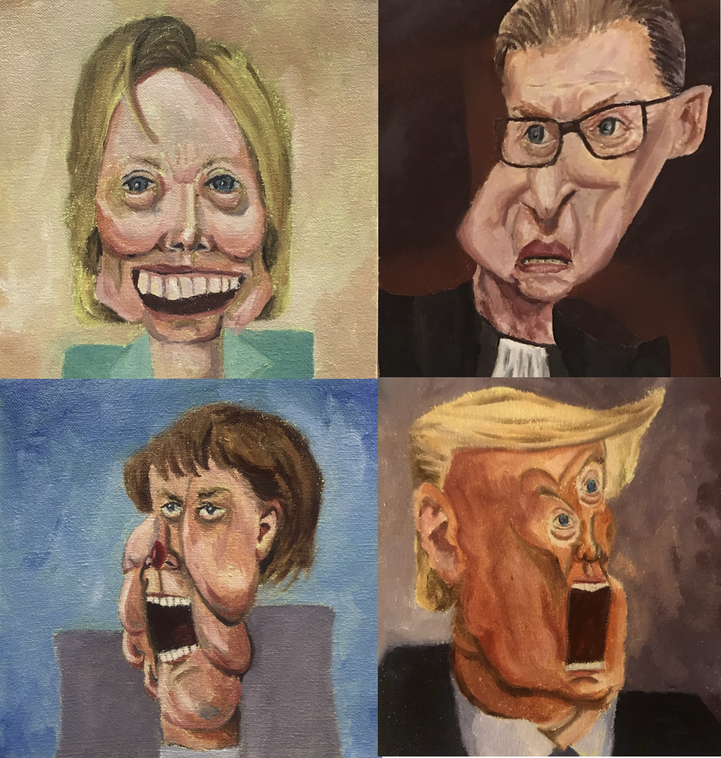 Although the subject matter of these paintings is political figures, they may not at first glance seem all that political. But I think the titles show a little subversiveness. Hilary (Trumped), for example is me imagining what the people’s choice for US president in 2016 might have felt like after a run-in with Trump. The title of my painting of Ruth Bader Ginsburg–RBG is Watching You–also betrays my political leanings (see last Thursday’s Instagram post for more, and give it a “like” while you’re at it!). Anyway, what do y’all think? Should I do more? Watch Instagram on Thursday for my painting of the woman I suspect will actually become the first woman president. See ya next week!