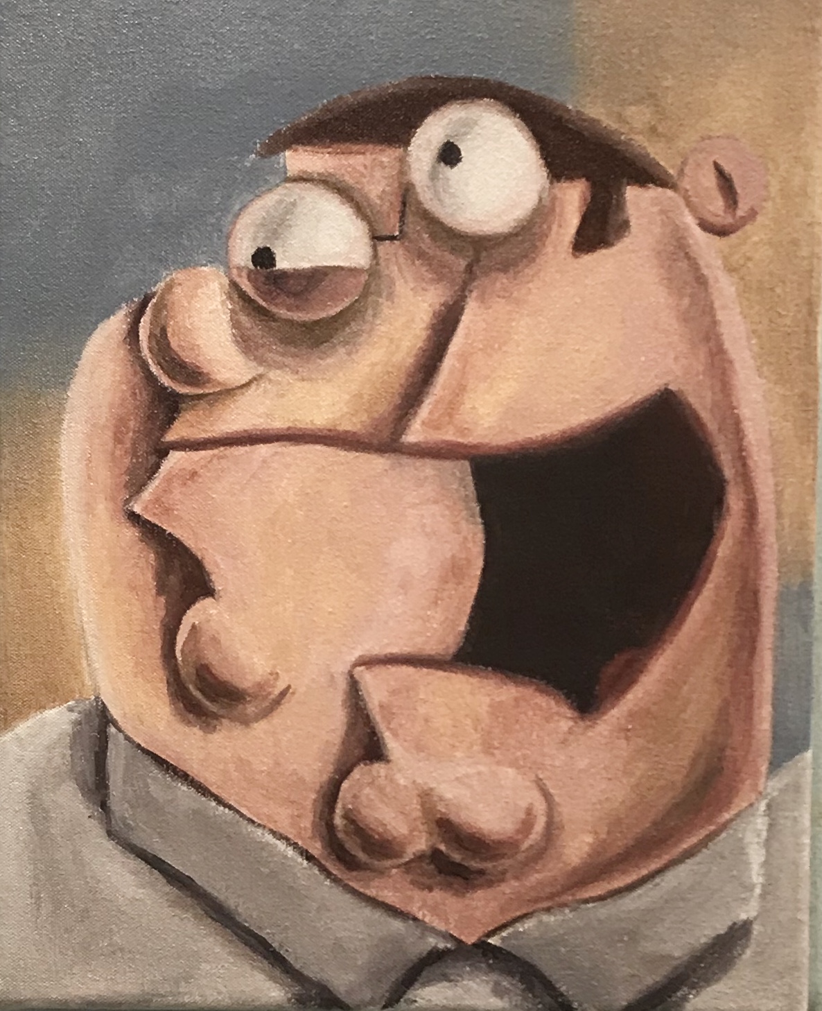 So last week I posted my painting of Peter Griffin which I was pretty confident would finally break through the dreaded algorithm on Instagram. And I was right. It’s the best post I’ve had in a while, though far from the best ever. That honour belongs to my painting of Alex from A Clockwork Orange, followed closely by Jack from The Shining. A couple of days after I posted Petecasso, I posted my painting of Homer Simpson, which I also figured would do well. And again, it did do pretty well, though not as well as Petecasso. On Tuesday of this week I posted my painting of Fred Flintstone (see today’s Instagram/Facebook posts for all of these images) and assumed it wouldn’t do as well as the other two, but would do better than average. Again, I nailed it. So I think the key word here, is: iconic. All of the above most successful posts are iconic. Got any ideas for iconic images I can recreate in my pychological cubism style? Damn damn damn, it’s frustrating that I still can’t allow comments on this blog. Hello, Artmoi, are you there?