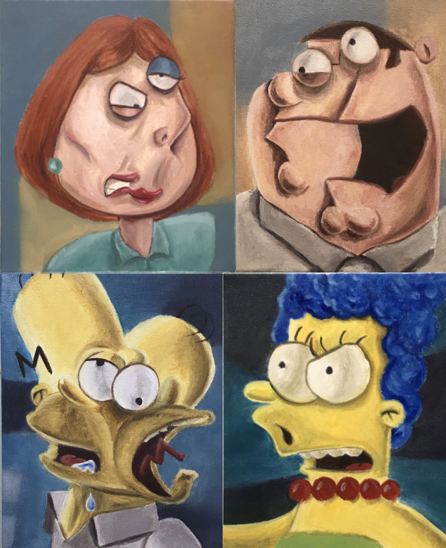 So of course doing these paintings has gotten me thinking about all the cartoon shows I’ve watched over the years. The Simpsons, South Park, King of the Hill, Bojack Horseman, F is For Family, Family Guy (there are probably more, and I’m not including really old ones for blog purposes). Here’s a weird tidbit of info about me: there is one thing all of these shows have in in common and that is, I didn’t like any of them at first. I had to go back to them and give them a second or even a third look. With each of those shows, I’m glad I did and for each one there is a different story as to why.